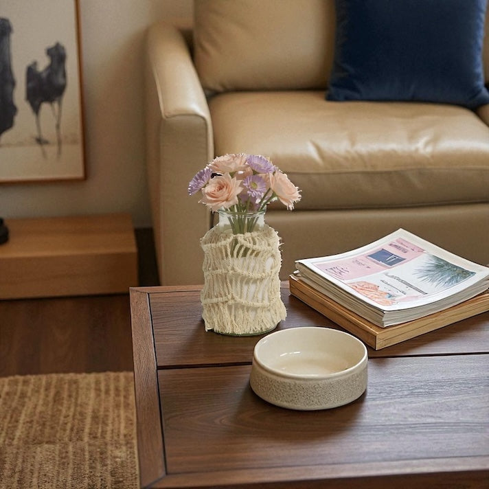Elevate your space with this charming set of 2 boho macrame glass vases, featuring intricate cotton cord wrapping that adds a touch of free-spirited elegance.